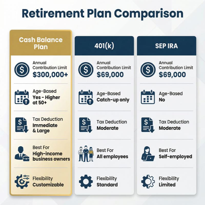 What a Cash Balance Plan is and how it differs from a 401(k) or SEP IRA.